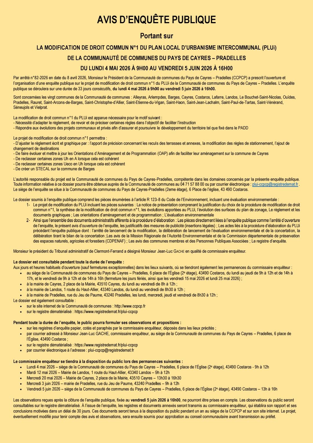 ENQUÊTE PUBLIQUE:MODIFICATION DU PLUI ( PLAN LOCAL D’URBANISME INTERCOMMUNAL) 17 avril 2026 Modification du PLUI ( Plan Local d’Urbanisme Intercommunal). Une enquête publique sera ouverte du 4 mai au 5 juin 2026.